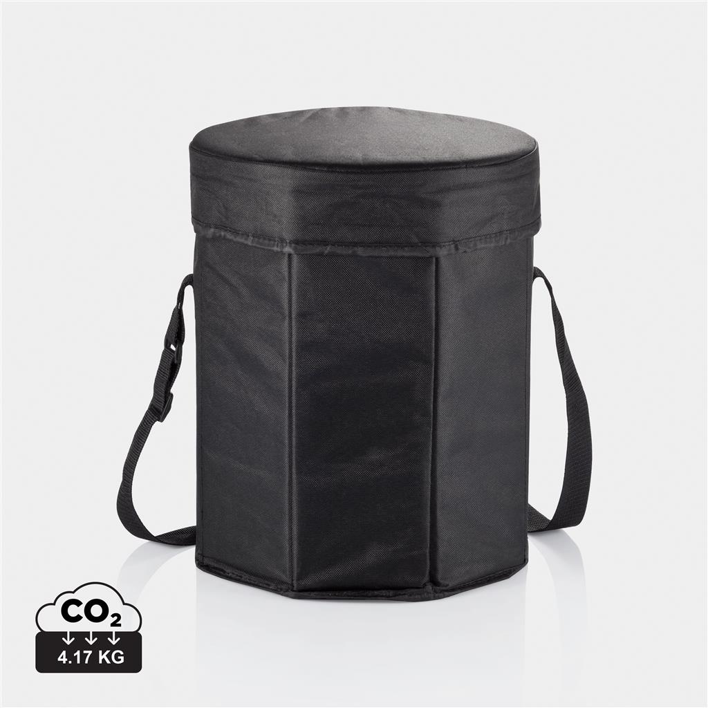 600D-polyesteriä PE-pinnoitteella, halkaisija 30 cm x korkeus 30 cm, kokoontaitettava. Voidaan käyttää sekä kylmälaukkuna että istuimena.