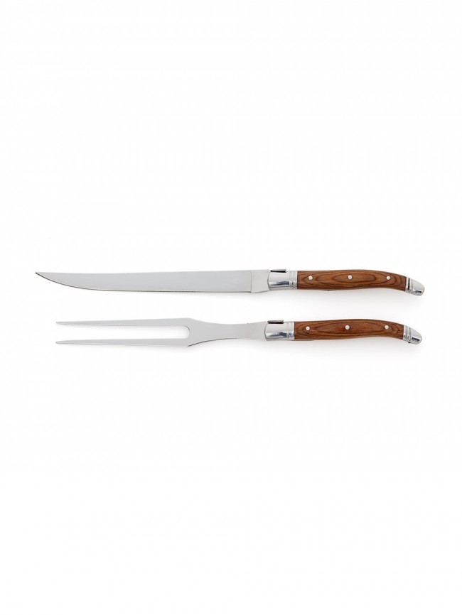 Terävä paistiveitsi ja –haarukka, joiden kahvat ovat konepestävää Pakkawoodia. Koko: 30,5x8,5x2,8 cm. Pakattu lahjalaatikkoon