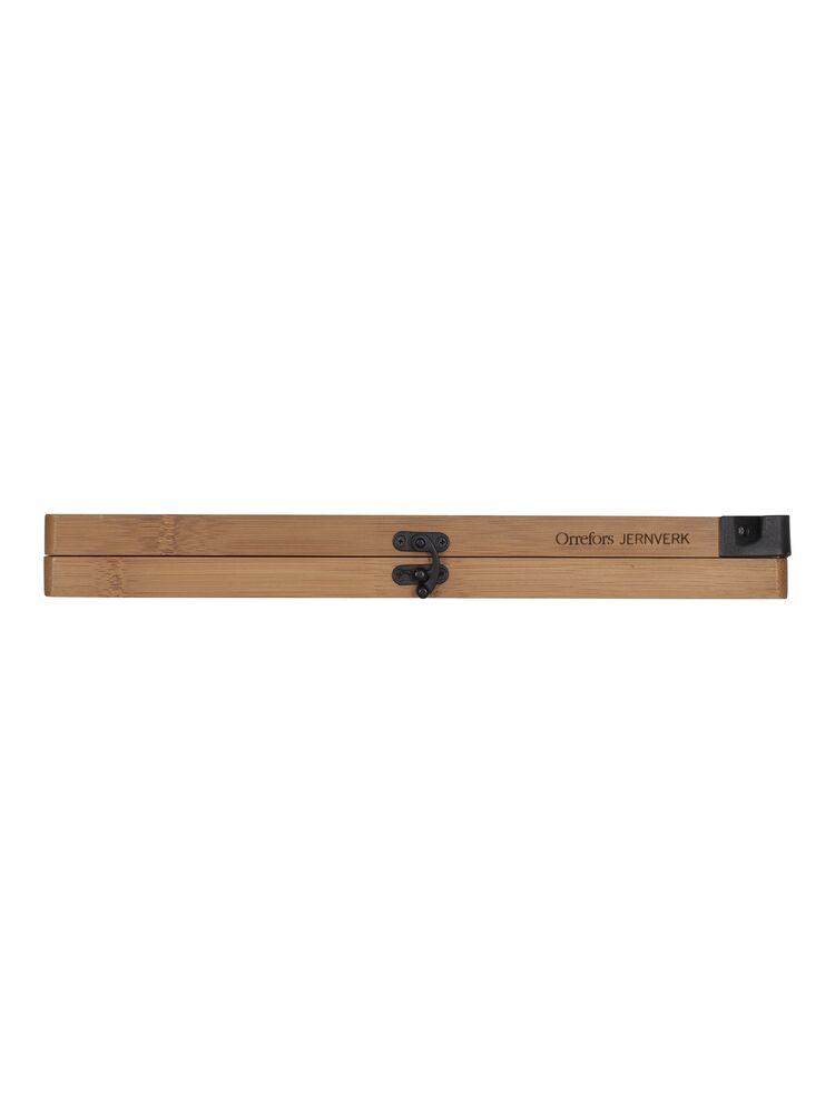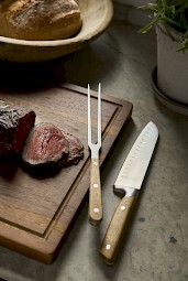 Orrefors Jernverkin klassinen leikkuusetti, joka sisältää Santoku-veitsen, haarukan ja massiivipuusta valmistetun leikkuulaudan.