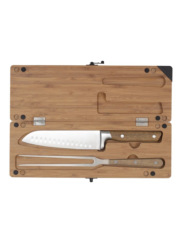 Leikkuulauta bambua, veitsi ja haarukka ruostumatonta terästä ja kahva akaasiapuuta.
