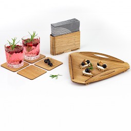 Pakkaus sisältää tarjoiluvadin, servettitelineen sekä neljä lasinalusta. Vati sopii kuivien elintarvikkeiden tarjoiluun. Ekologinen tammipintainen vaneri on käsitelty vettä ja likaa hylkiväksi elintarvikekelpoisella parafiiniöljyllä. Pinnan voi pyyhkiä vedellä kostutetulla liinalla.