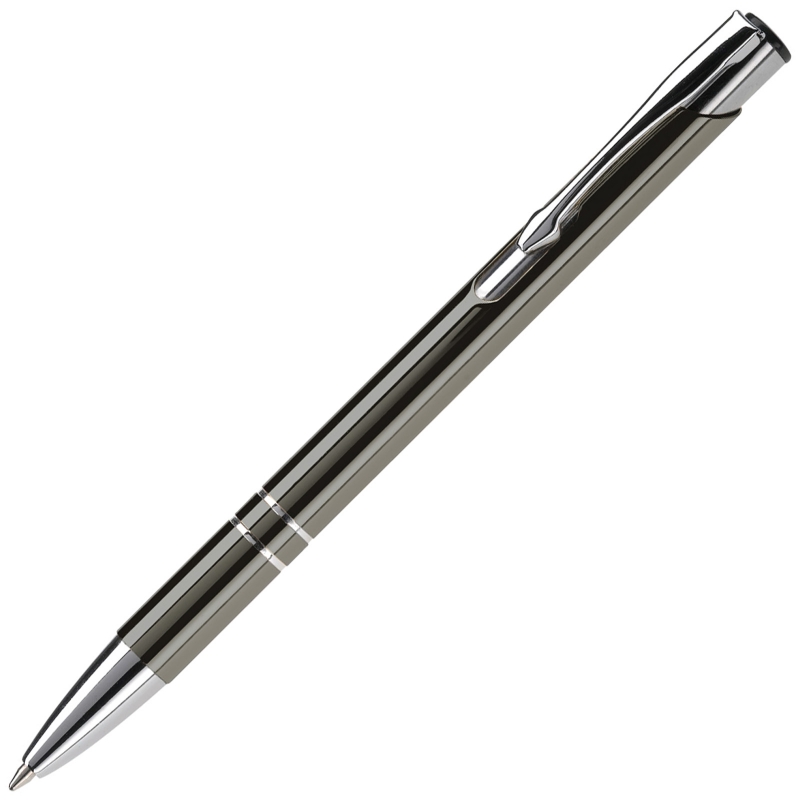 Elegantti alumiinikynä, jossa kaksi somisterangasta. Muovisäiliö, jossa sininen muste.