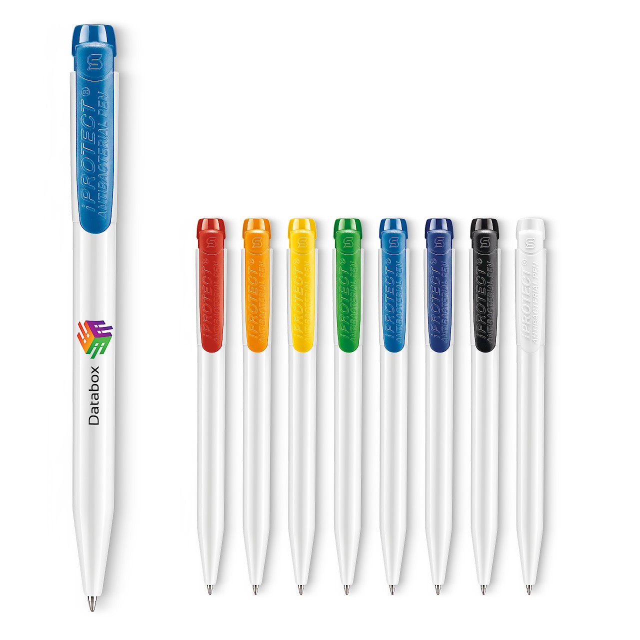 iProtect antibakteerinen kynä on valmistettu ABS-muovista, johon on valmistuksessa lisätty sinkki-ioneja. Tämä yhdistelmä luo bakteereille epäsuotuisan kasvualustan joka kestää koko kynän eliniän. iProtect Antibakteerinen kynä soveltuu erityisesti lääketieteen- ja ensihoidon alalle. Erinomainen myös kouluissa, julkisissa tiloissa, sairaaloissa ja ravintoloissa. Valkoinen runko ja värillinen klipsi. Sininen X20-mustetäyttö.