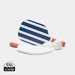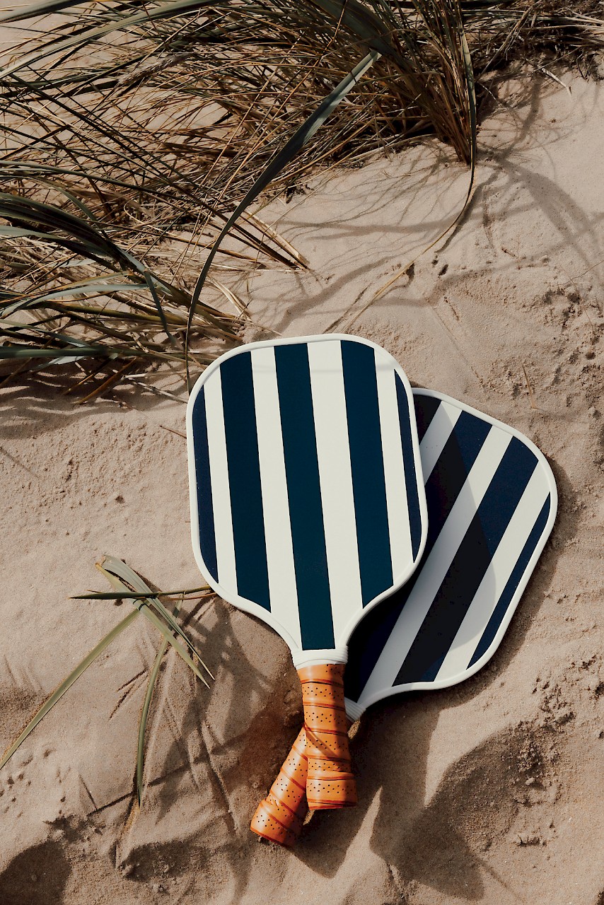 Nauti päivästäsi altaalla, puistossa tai rannalla tämän pickleball-setin parissa. Setti sisältää kaksi mailaa ja yhden pallon. Mailat on valmistettu FSC®-sertifioidusta vanerista, ja niissä on klassinen kaksivärinen raidallinen kuvio toisella puolella sekä tyylikäs valkoinen pinta toisella.